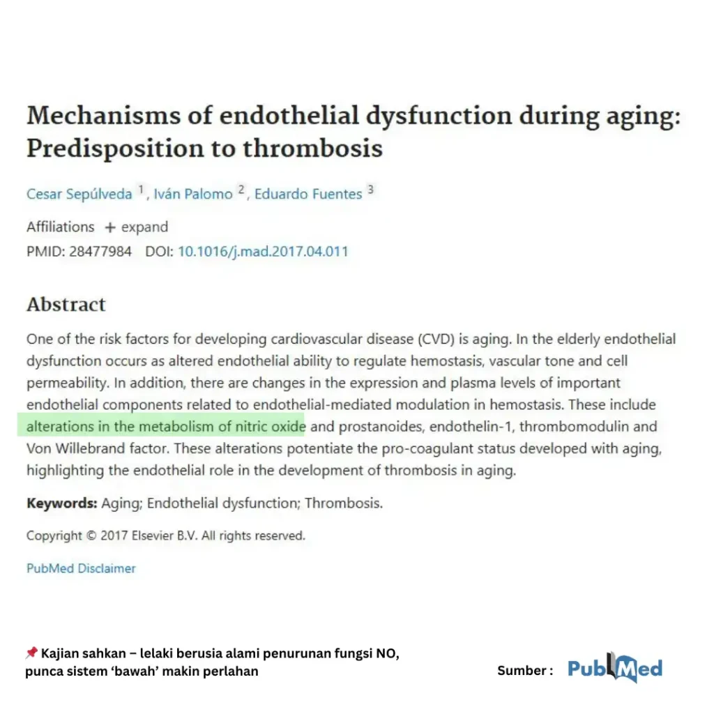 Kajian Elsevier (2017) dapati, bila fungsi endothelial menurun, penghasilan Nitric Oxide (NO) juga turun  dan aliran darah ke zakar makin perlahan.